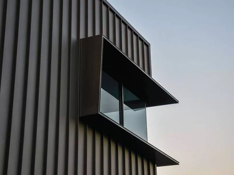 یوځل چې د فولادو چوکاټ بشپړ شي، د چت سیسټم نصب کیږي، په ځانګړي ډول د موصل شوي فلزي تختو یا واحد پلای جھلی موادو څخه جوړ شوی. بهرنی دیوالونه، که په ډیزاین کې شامل وي، د فلزي تختو، خښتو، یا نورو پوښښ موادو په کارولو سره هم نصب شوي.